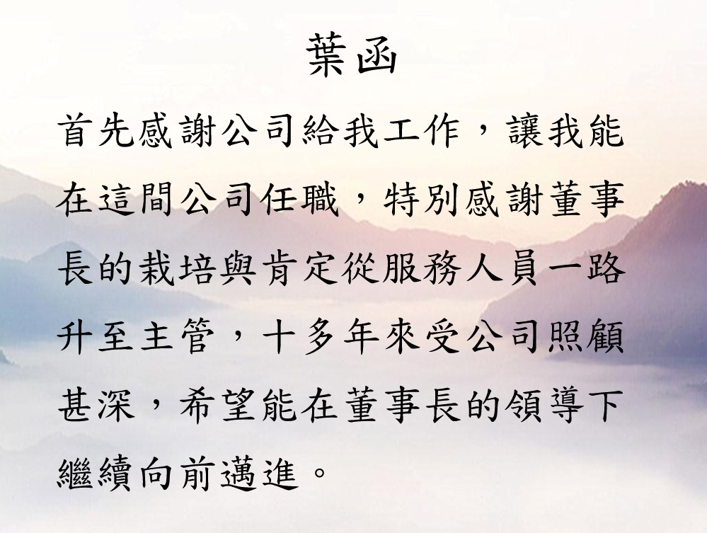 介壽陳國信(105年10月4日到職)對於現場的場務及狀況極具熟悉,出勤狀況良好,並能落實公司指示、忠誠度極高,故晉升儲備場長乙職。