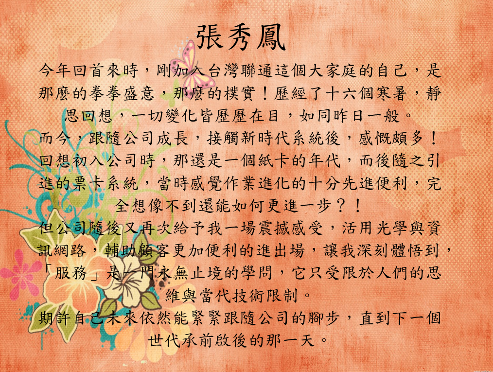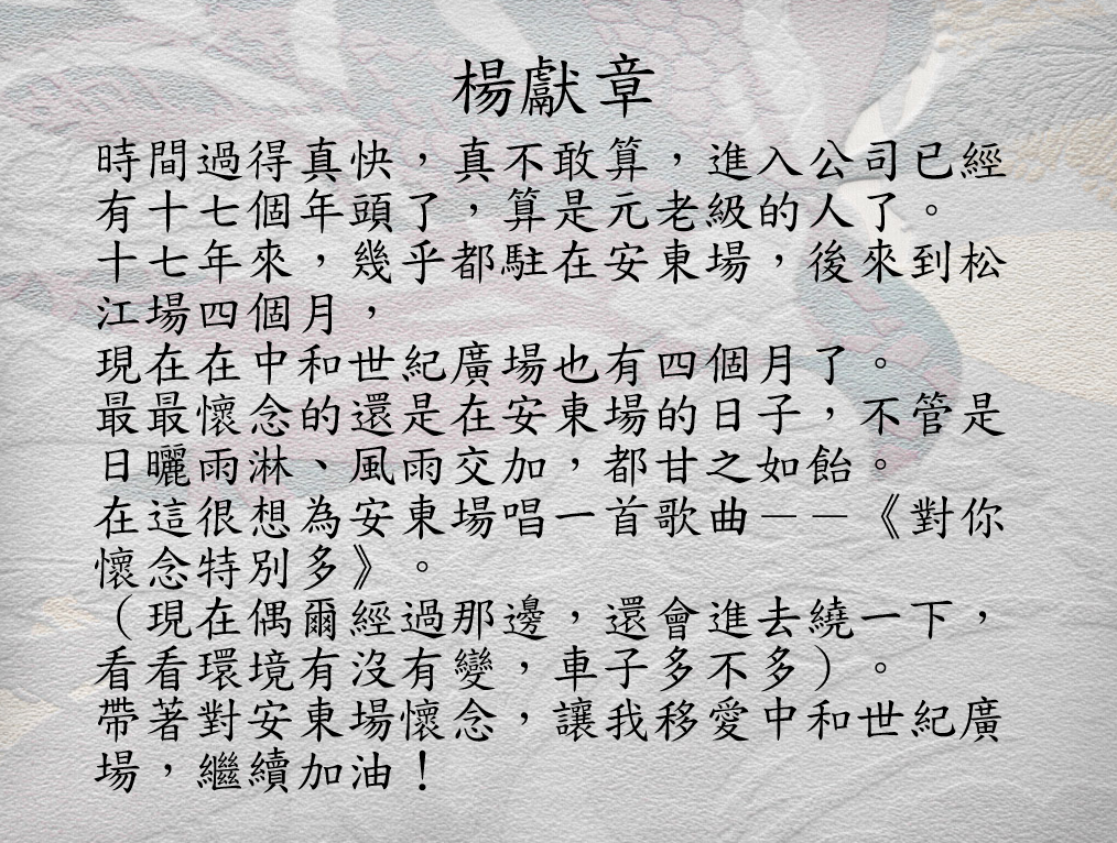大世界服務人員梁華順(到職日102年7月1日)對於現場的場務、環境及狀況極具熟悉與客人間有良好互動,主動回報場地營運狀況,假日時段各層人員安排得宜,自111年5月迄今出勤狀況良好,配合並能落實公司指示忠誠度極高,故晉升場長乙職。