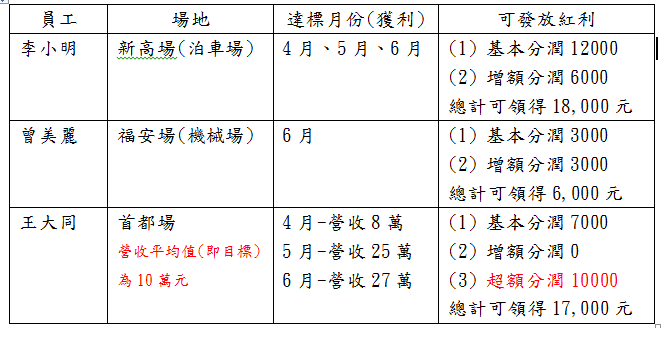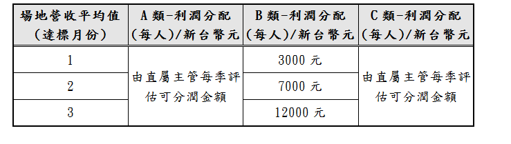 (a) 金額計算將參酌場地之營收、員工表現、主管評比等。