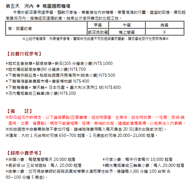 ※費用-不含領隊導遊司機服務費:NT200元*5天=NT1,000元