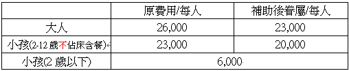 小孩(2-12歲不佔床含餐):原23,000元,只需負擔20,000元。