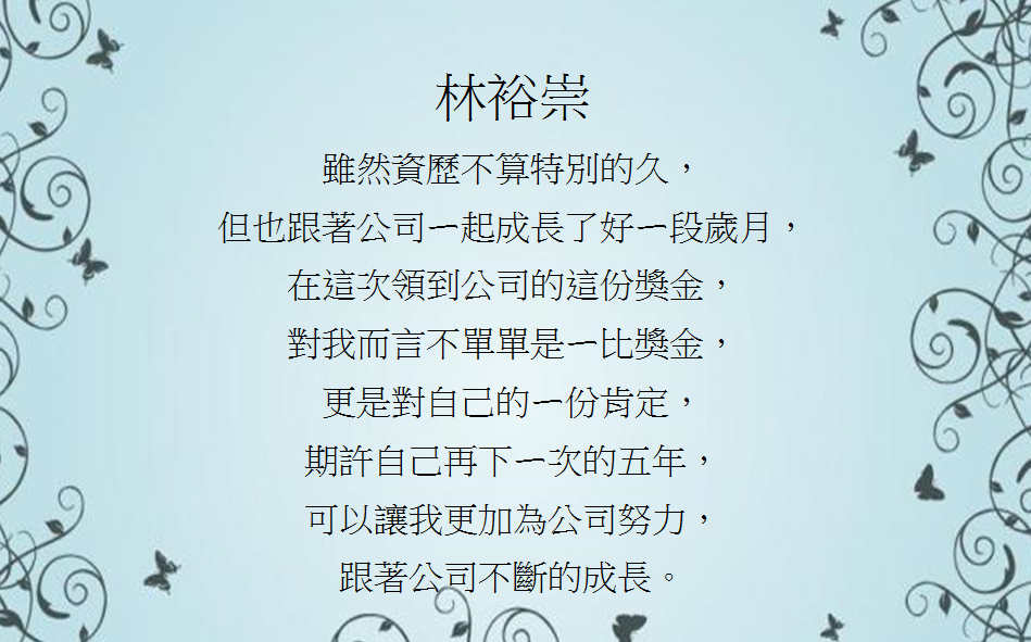 晴光商圈場戴宜驊(106年7月1日晉升儲備場長),積極進取改善各項場務缺失,績效面能不負公司所託盡心盡力完成營運目標。