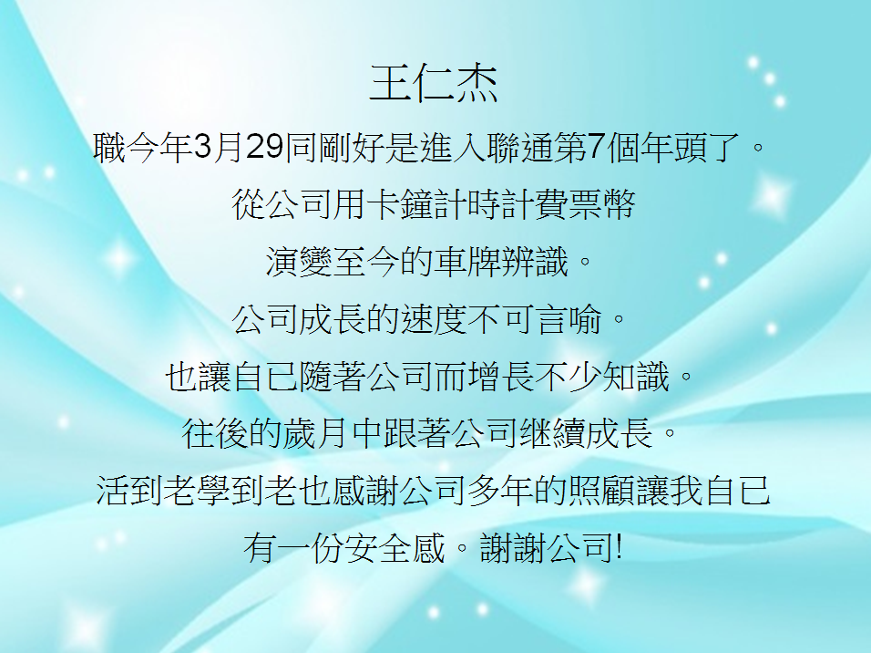 安和場服務人員鍾佩勳(105年6月1日到職)於1月8日經現場客人來信表揚,自轉調到安和場工作時間服務態度認真、親切,對所有要停車車輛都非常耐心指揮,且非常有禮貌,對公司形象具加分效果,予以肯定,希望員工都能和鍾員看齊。