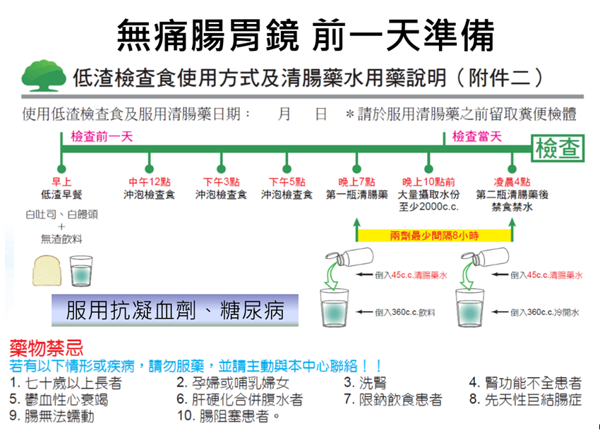 建議報名日期以自己的週休時間為主,因大腸鏡檢查需配合食用低渣早餐、低渣檢查食(中午12點、下午3點、下午5點)及清腸藥水(晚上7點、凌晨4點,飲用後需隨時跑廁所),請自行斟酌健檢前日是否需安排休假(請參閱附件二大腸鏡檢查準備事項)。