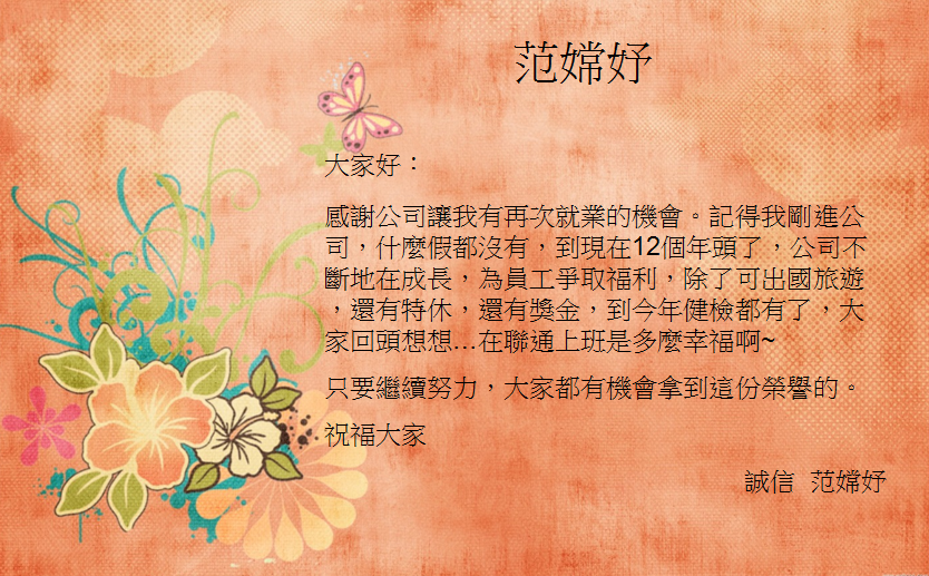 大家辛苦啦~為感謝同仁們的努力,將於107年10月31日以匯款方式發放一○六年度員工紅利,慰勞大家。希望大家繼續打拼,明年也可以有此佳績!