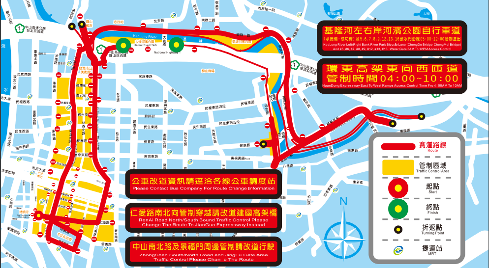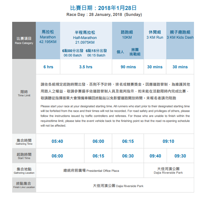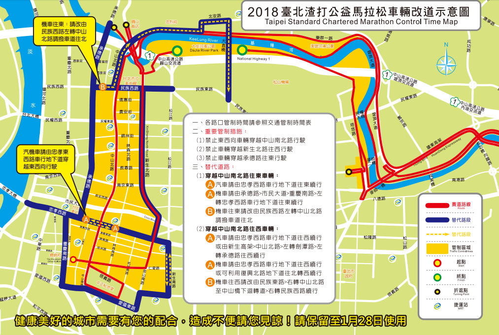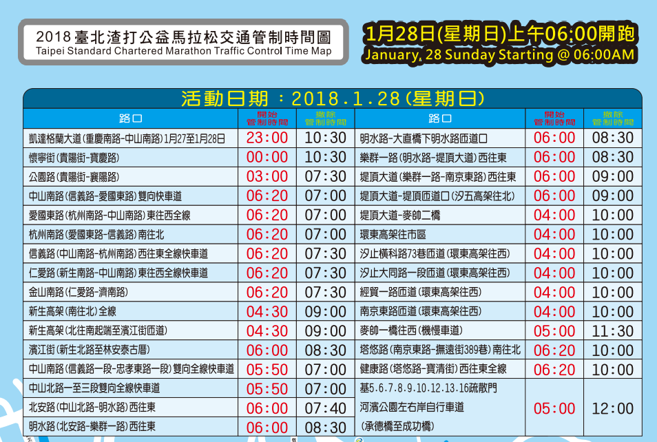 臺北渣打公益馬拉松路跑活動 2018年1月28日(星期日)交通管制時間及路線