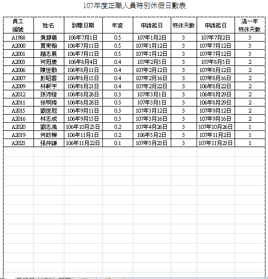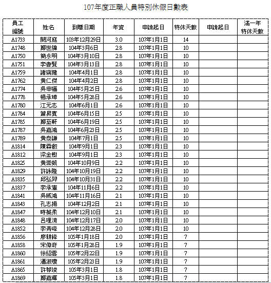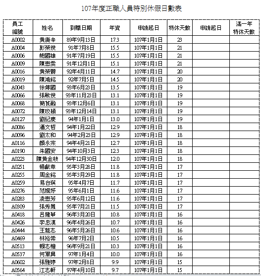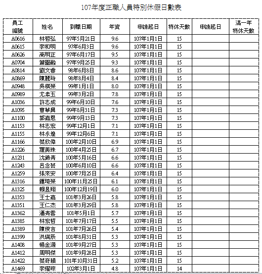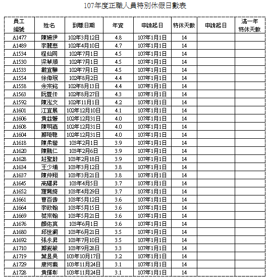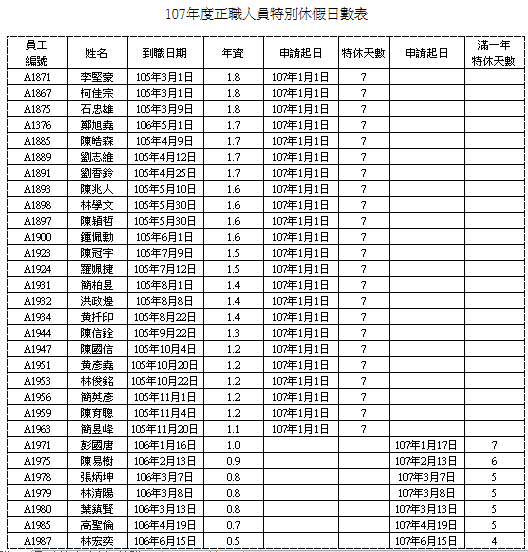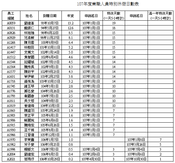 又到歲末年終之際,感謝大家這一年的努力!為讓大家在忙碌之餘能安排時間自我充電及陪伴親友,107年特別休假計算方式如下: