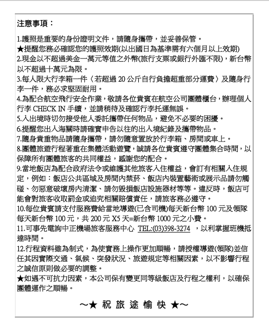 備註:若護照欲自行攜帶至機場者,請來電告知並簽妥”護照證照自帶切結書”交回公司。