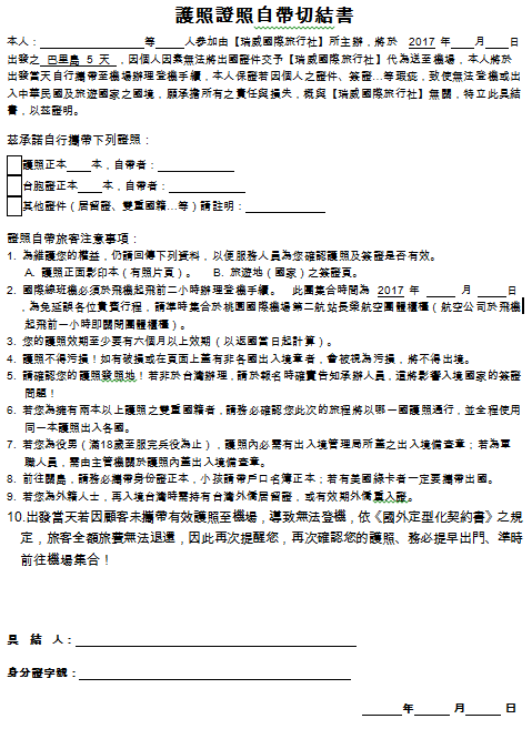備註:若護照欲自行攜帶至機場者,請來電告知,並簽妥”護照證照自帶切結書”交回公司。
