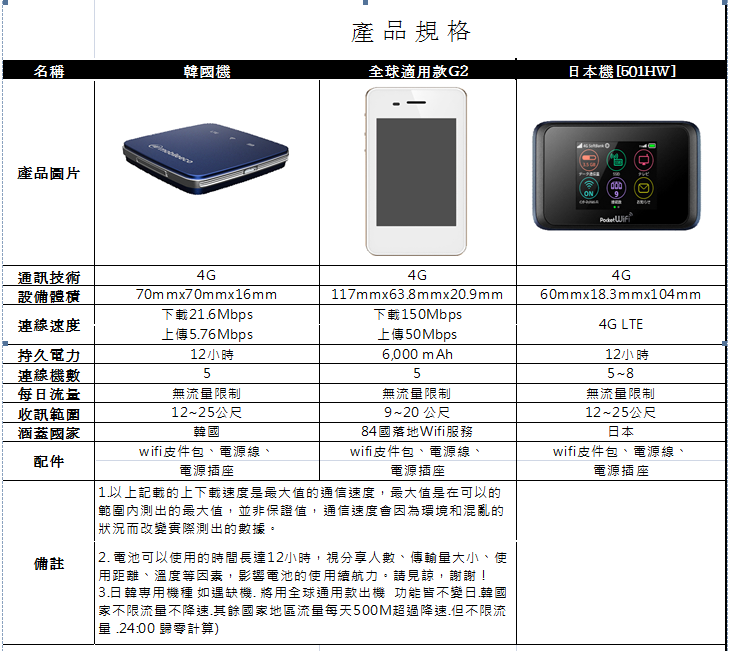 補充:一台WI-FI機可使用3-5台行動裝置(例如:手機、iPad等...) ,建議使用範圍為同一房間內。