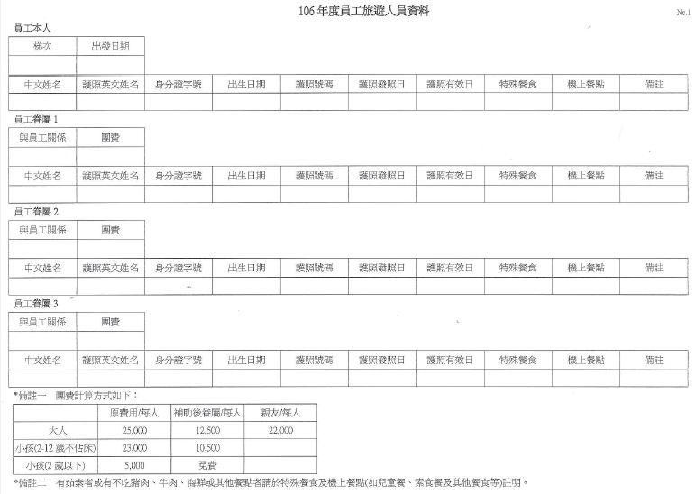 請將填寫完畢之「106年度員工旅遊人員資料」及護照影本 於4/20日前繳回公司